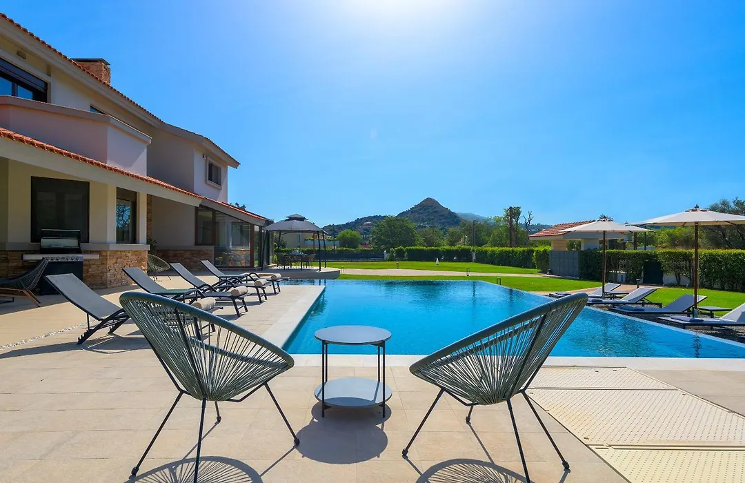 Von einer Terrasse der Villa Greenheart - Mediterranean Elegance In Nature aus können Gäste einen Ausblick auf die Berge genießen.